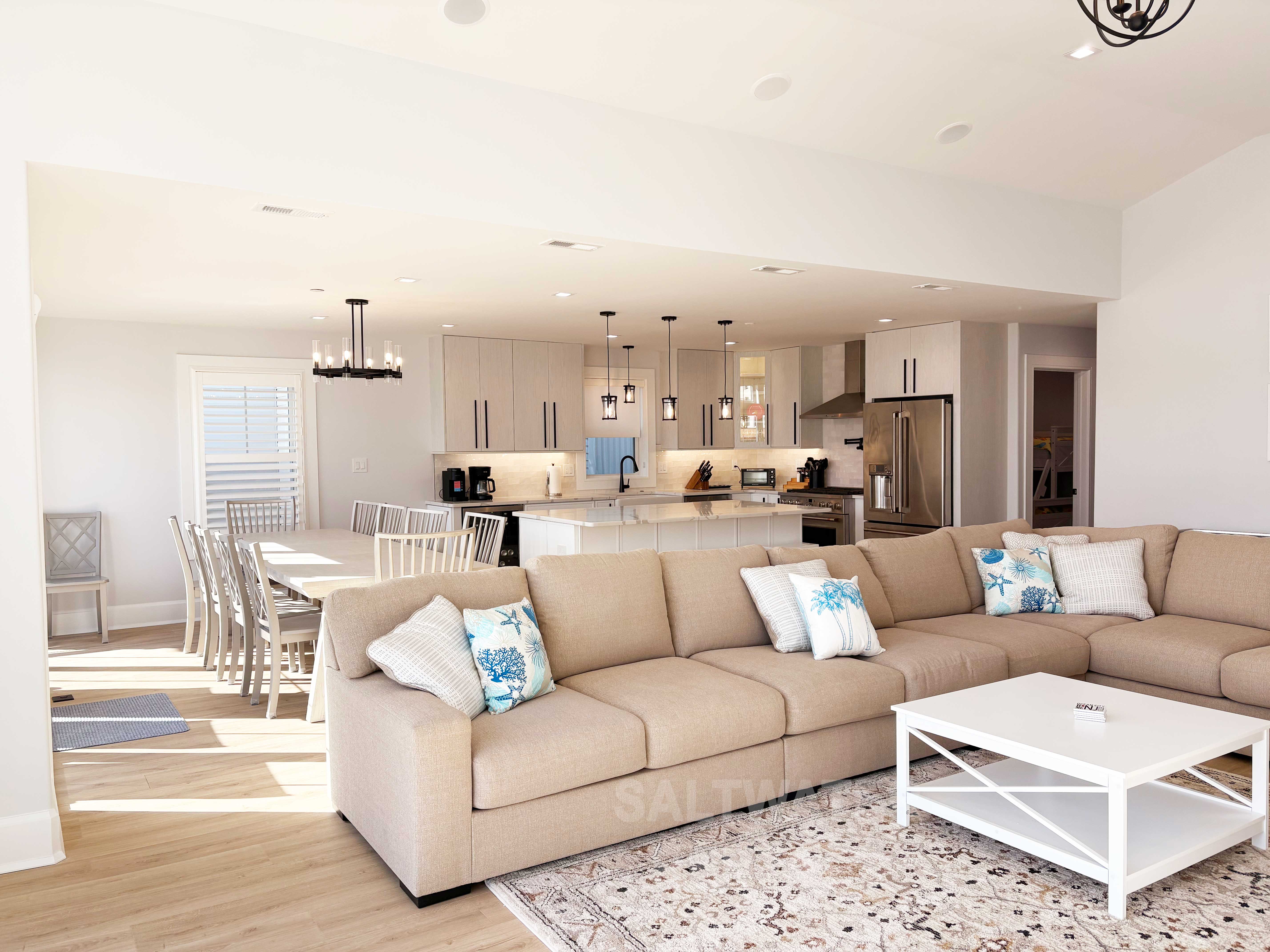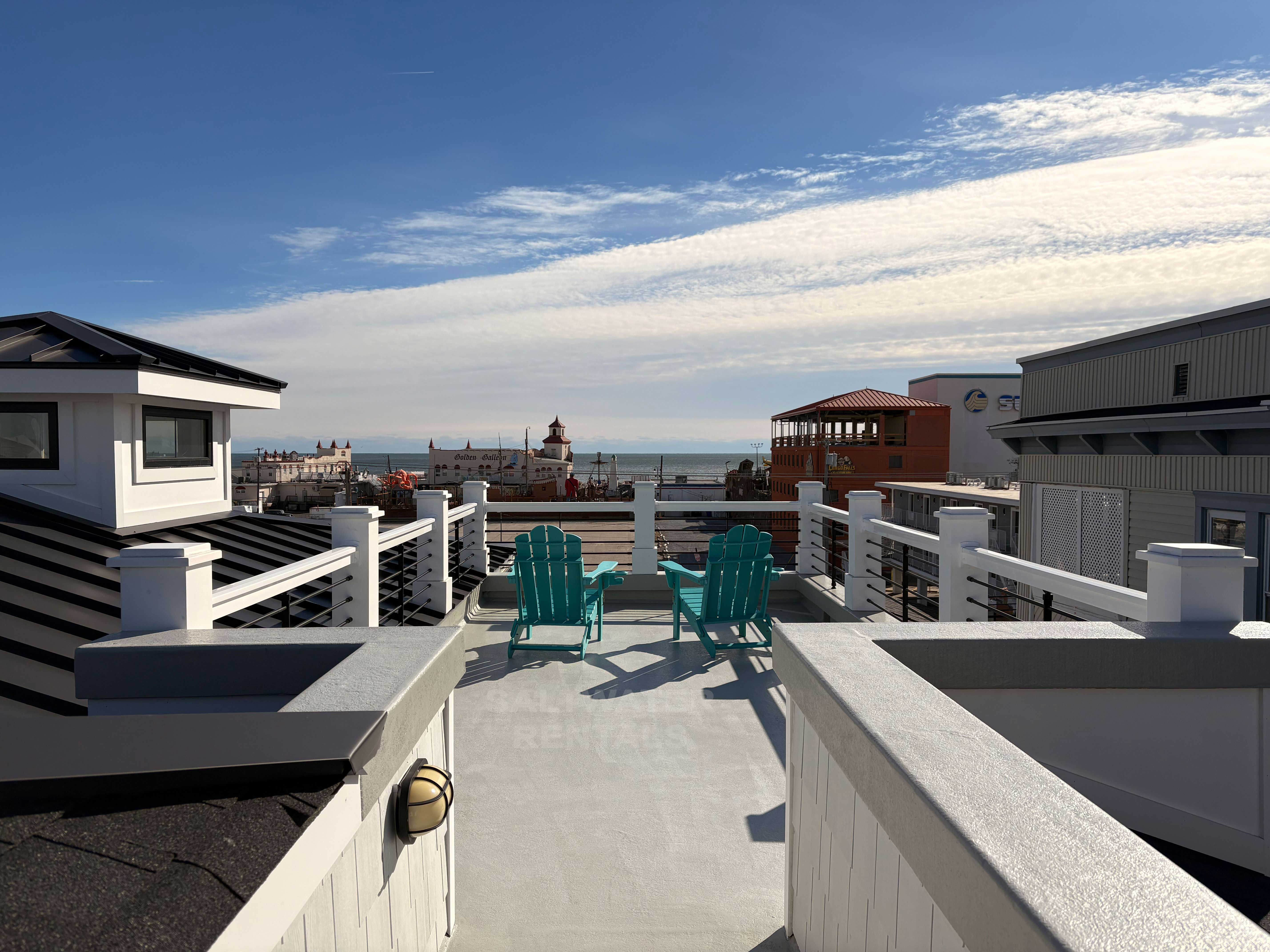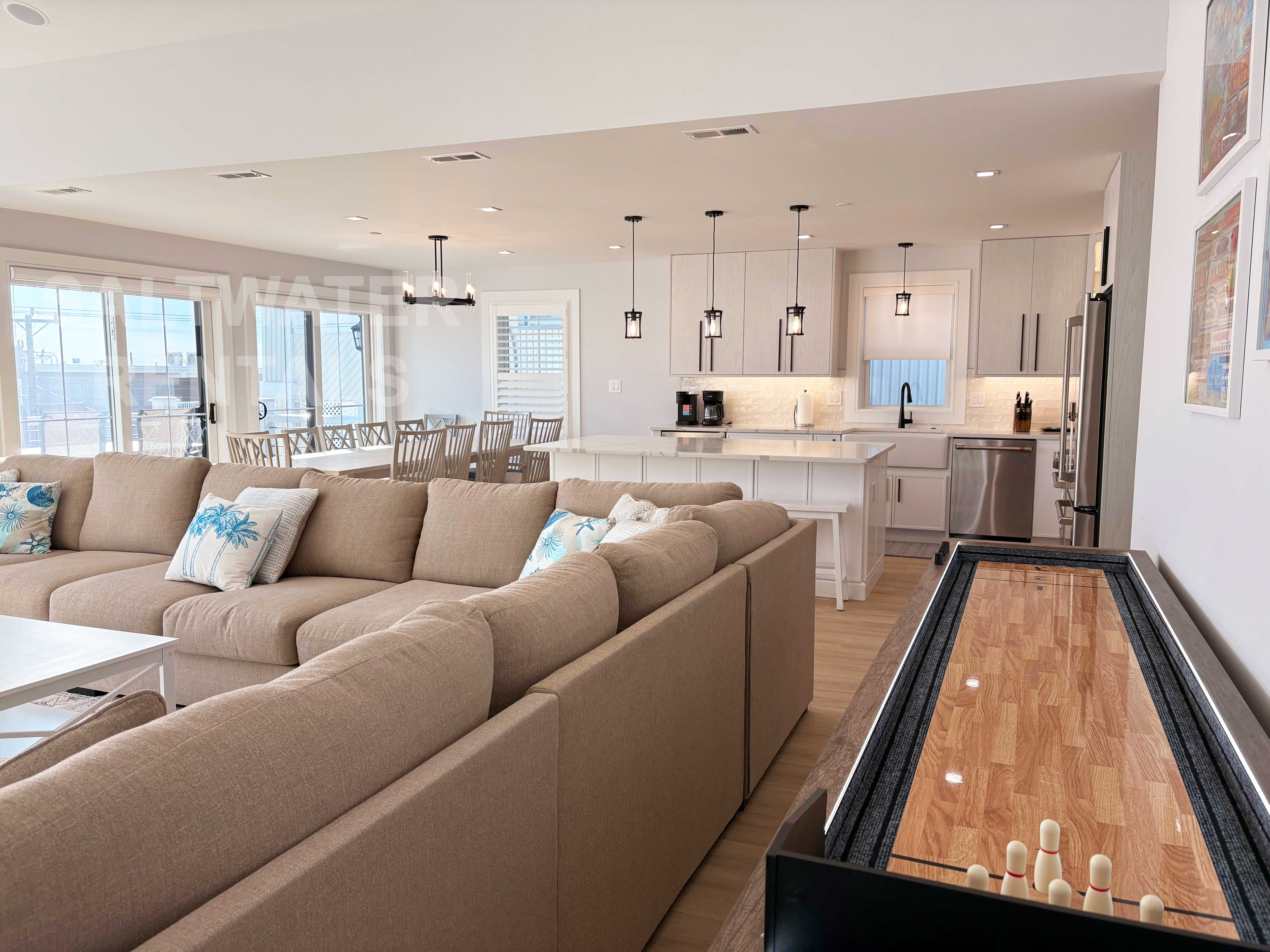 Wake up to breathtaking sunrise views from the front deck or your private rooftop deck, and enjoy all-day sun and sea breezes. Inside, the home features an expansive open-concept living room, dining area, and kitchen, offering plenty of space for everyone to relax and reconnect. Rainy day? No problem—enjoy a friendly game on the shuffleboard table, a unique perk rarely found in Ocean City rentals.