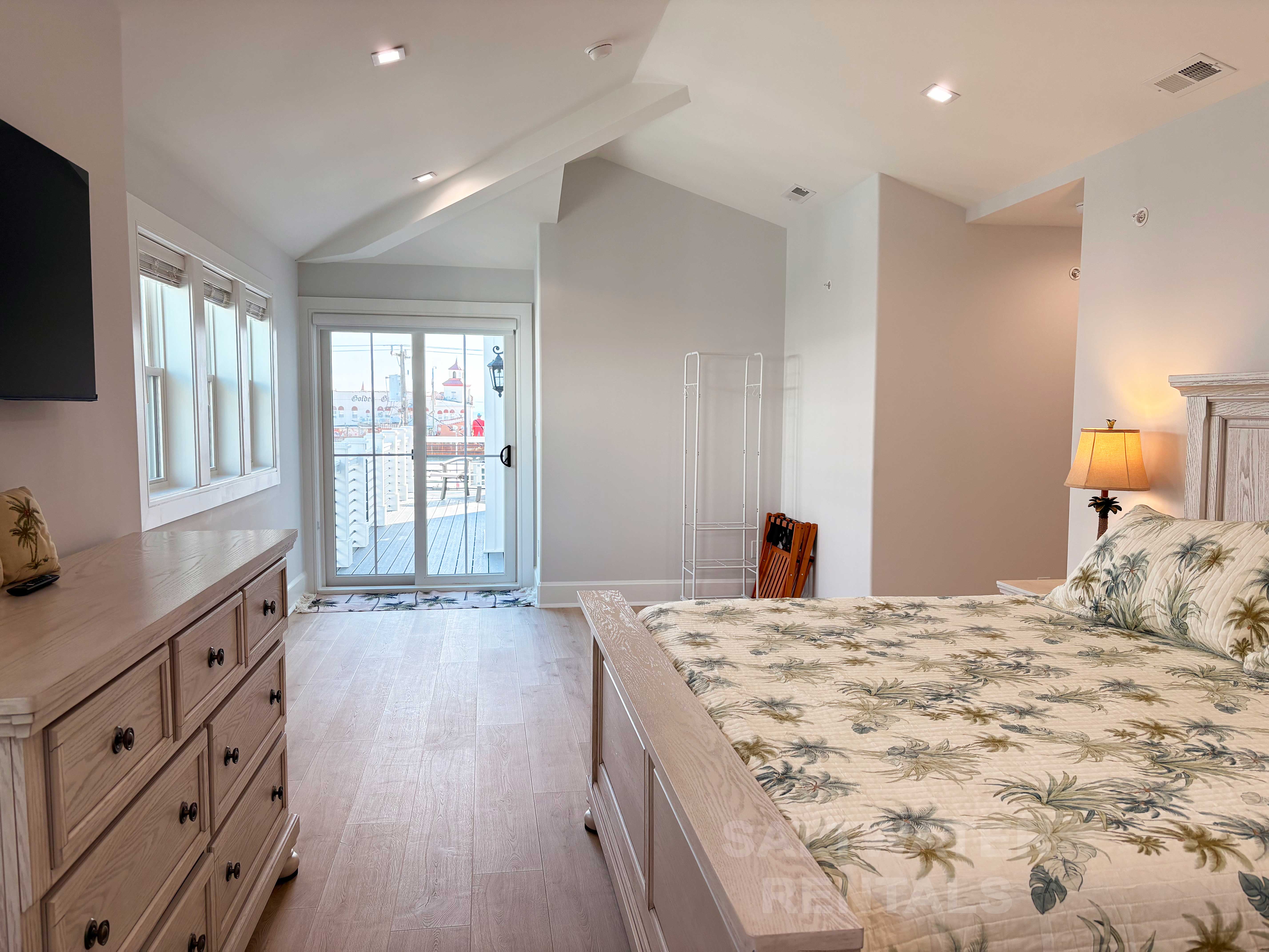 The outdoor wraparound deck off the main living area is perfect for al fresco dining, morning coffee, or winding down after a day on the beach. The primary suite includes a private bath and deck access, while additional accommodations include two Jr. Suites, a king bedroom, and two bunk rooms, making this the ideal family-friendly and large-group vacation rental in Ocean City, NJ.